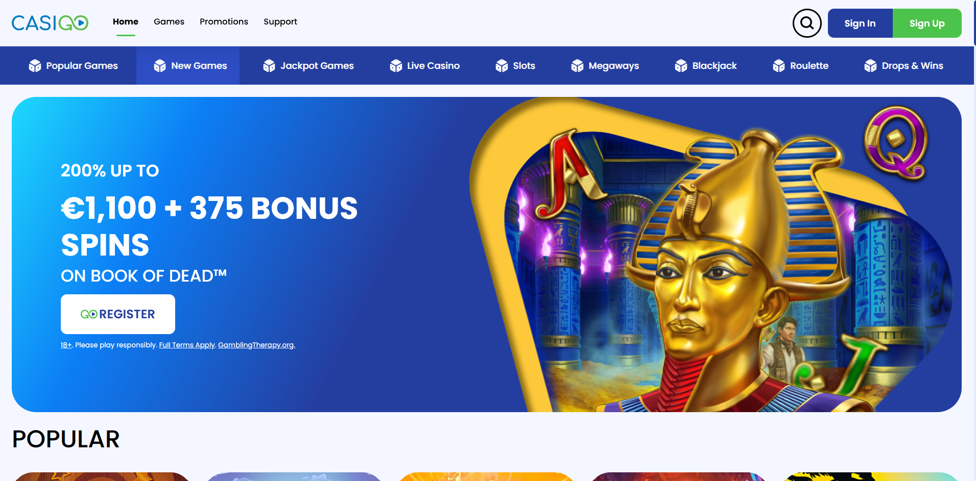 CasiGo4.8/5200% up to €1100 plus 375 bonus spinsSmooth gameplay and fast payouts